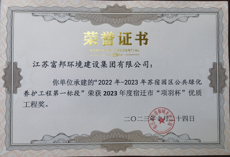 近日,由宿遷市蘇宿園區(qū)建設(shè)發(fā)展有限公司負(fù)責(zé)管理的蘇宿工業(yè)園區(qū)2022-2023年公共綠化養(yǎng)護(hù)工程第一、二標(biāo)段,同時(shí)榮獲2023年度宿遷市“項(xiàng)羽杯”優(yōu)質(zhì)工程獎(jiǎng)。