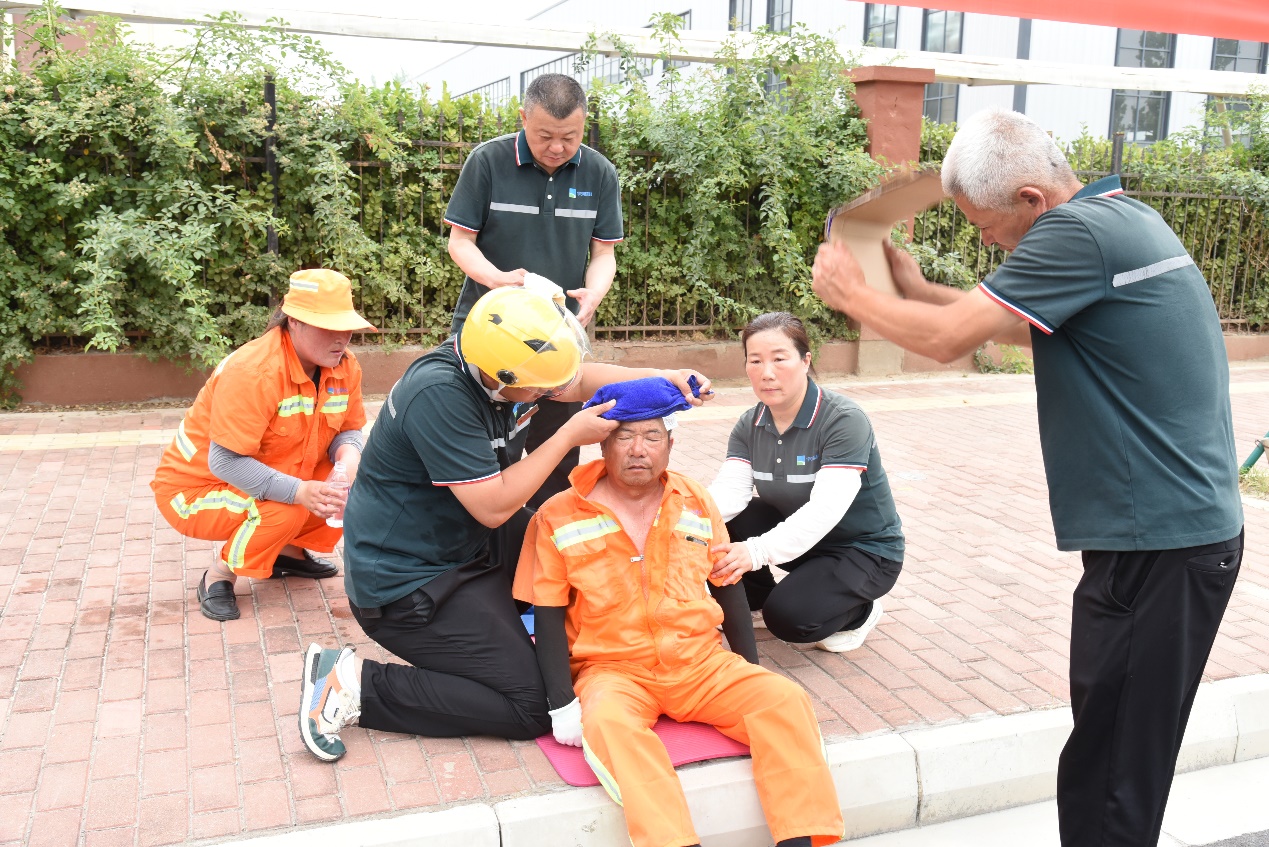 此次演練模擬鏡泊湖路一名環(huán)衛(wèi)工人在作業(yè)過程中,突然感到頭暈、心慌乏力,立即向主管人員電話求助。主管人員隨即趕到現(xiàn)場(chǎng)查看情況,發(fā)現(xiàn)環(huán)衛(wèi)工人躺坐在現(xiàn)場(chǎng),面色潮紅、大汗淋漓,精神狀況不佳,系中暑跡象,立即向項(xiàng)目經(jīng)理報(bào)告,聯(lián)系應(yīng)急救援人員,并呼喊附近作業(yè)人員將其攙扶到陰涼處,解開衣扣散熱,應(yīng)急救援人員趕到現(xiàn)場(chǎng)后,立即用濕毛巾、酒精棉擦拭身體,涂上清涼油,喂服藿香正氣水、淡鹽水......,經(jīng)過初步救護(hù),中暑人員癥狀得以緩解后,隨即將其送往園區(qū)社區(qū)衛(wèi)生服務(wù)中心進(jìn)一步治療。
