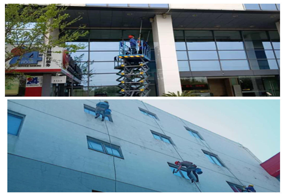 施工現(xiàn)場(chǎng)做好安全保障措施,現(xiàn)場(chǎng)清潔人員配戴安全頭盔、安全帶,嚴(yán)格按操作流程實(shí)施外墻清洗。