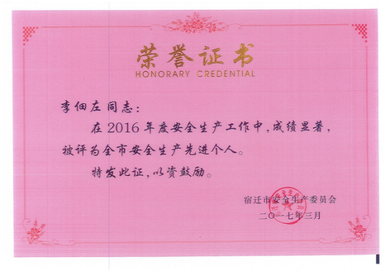 2017年3月,物業(yè)部李佃左同志獲得宿遷市安全生產(chǎn)委員會授予的“全市安全生產(chǎn)先進(jìn)個(gè)人”榮譽(yù)證書。